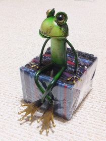 《左》このカエル君は喫茶店に飾られていました。「どこに売ってますか?」と聞いてお店に直行!