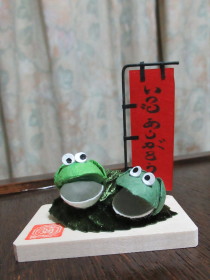 《中》繭でできたカエルくん!赤い幟の言葉は「何でも書いてあげるよ」とその場で書いてもらいました。