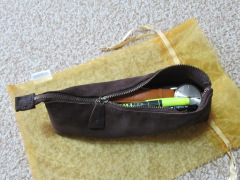 《下》ペンケース:手触りが素敵です。右は、開けたところ。たっぷり入るので、重宝してます。
