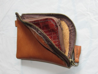 《左》財布:中の小さい所にはコインが入ります。その外側にはお札やカードも入れられます。