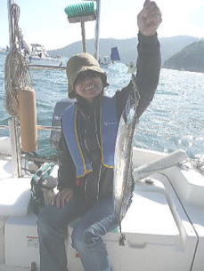佳子さんは「ウケルー!!」と大笑い、私はキツネにつままれたみたい。夫は「釣れたんが分からんかったんか?」と言うし(全く分からんかった鈍い私・・・)、新一さんは「よく逃げなかったなー」と感心しきり。というわけで、私の初獲物は、心優しい太刀魚クンが餌についてきてくれてのゲットとなりました。ヤッタネ(^_^)v