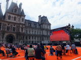 それから5日後の昼、全く偶然に通りかかったパリ市庁舎の前で、錦織圭選手の試合を見ることができました。市庁舎前の広場には、大画面と椅子やテーブルなどが用意してあり、ローランギャロスの生中継をみんなで見られるようになっていました(もちろん、料金はかかりません)。翌日は、また市庁舎前に行き、フェデラー選手の試合も見て、私たちのテニス観戦も終わりました。\(^o^)/