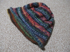 昔から編み物は大好きでした。帽子やマフラー、セーターも編みました。模様編みもしましたし、複雑な編み込みもしました。が、夢中になってしまって、やらなければならないことが滞ることがあるのでやめていました。1年前の冬に自助会のメンバーさんから「こんなのがあるよ」と教えてもらったのが、帽子にもできるネックウォーマーです。色とりどりの縞模様が美しく、どうやって編むのだろうと思ったら、そういう段染めの毛糸があると言います。だったら、輪針でひたすら編むだけでいいんだわ、と毛糸を買いに走りました。