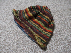 そして、編んだうちのひとつがこれ↓です。左端の写真のように、腹巻のように編んでいき、半分のところで毛糸を変えます。このままネックウォーマーとして首に巻いて使うこともできるし(出す色を変えて楽しめます)、真ん中でねじって半分裏返すと、帽子にもなります(右の2つ)。二重になるので暖かいし、半分ずつ色が違うので、気分や着る物に合わせてどちらでも使えて便利です。