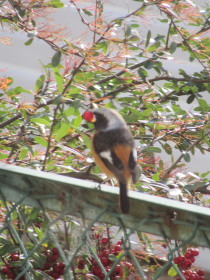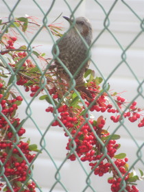 昨日と同じのでしょうか。庭の隅でたわわになっているピラカンサの実が目当てのようです。そのうちスズメほどの大きさで胸のところがオレンジ色の鳥も来るようになりました。