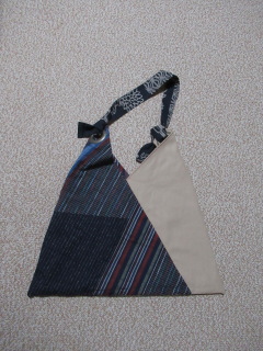 右のカバンは形が気に入って作り始めました。一枚布を切ってミシンをかけて・・・と本(『かたちがステキな和布のバッグ』ブティック社発行)には書いてありましたが、柄の部分は端切れを繋ぎ、全て手縫いで作ってみました。手芸屋さんも店を開け始めていたので、無地の布は柄に合わせて購入できました。持ち手の部分は、5cmのハト目(アイレットリング)を付けて、ひもを通して結んでいます。