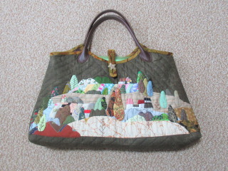 左はアップリケをしたカバン。A4サイズの書類が入る大きさです。細かい部品(山や木や家など)をちまちまと作って、はりつけていきます。キルティングも全部しました。いつもは、面倒だと感じるキルティングも、少しずつやれました。(アップリケ部分は『はぎれ布で描く絵模様のパッチワーク』、カバンのデザインは『パッチワークのかわいいギフト』を参考にしました。どちらも「株式会社パッチワーク通信社」発行です)