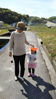 3枚目(右)は、お孫ちゃんと散歩しているYさんです。空と川と畑と山、・・・美しい風景の中にカワイイお孫ちゃんとばぁば。二人のお顔が見えなくても嬉しそうな様子が想像できますね。ご本人は、「孫の笑顔が可愛いのと、自分の立ち姿があまりに母にそっくりすぎて、いっぱい笑える写真になっていました。」とおっしゃっていました。